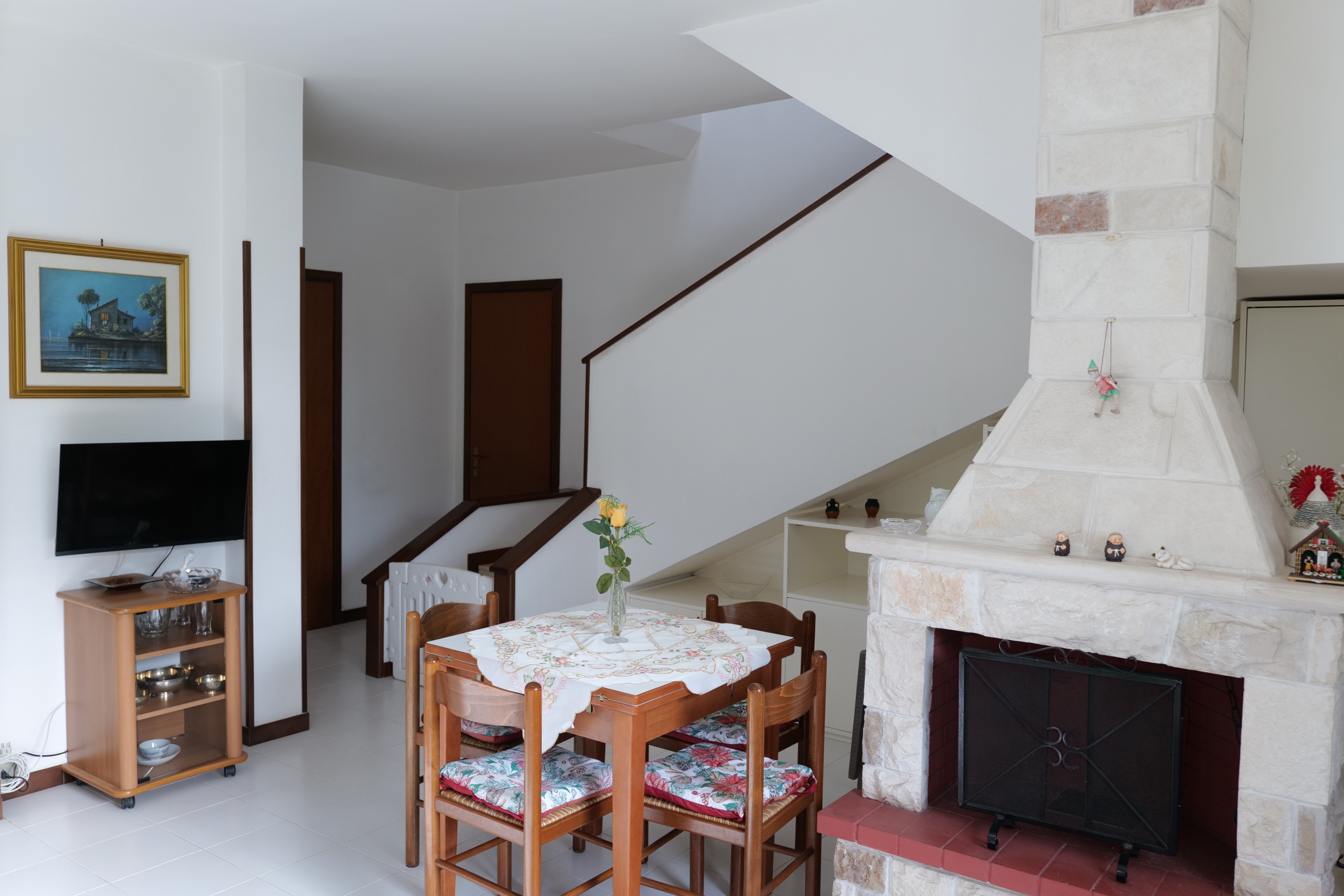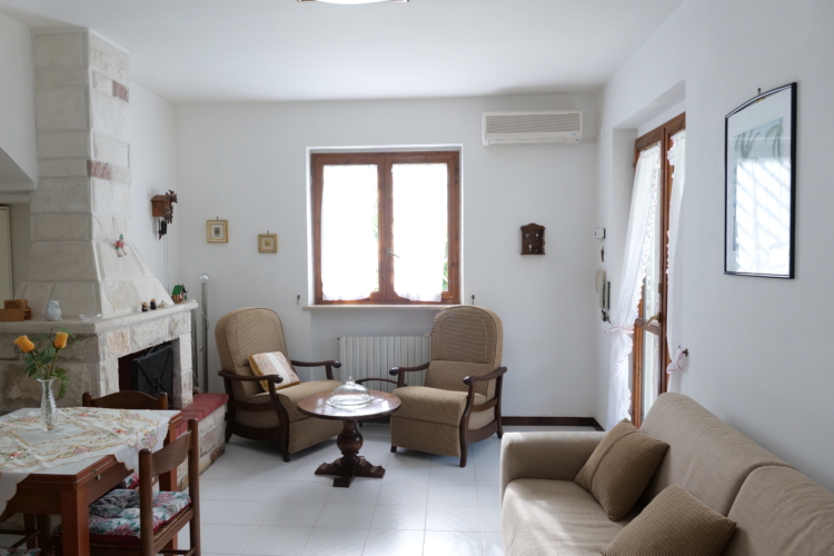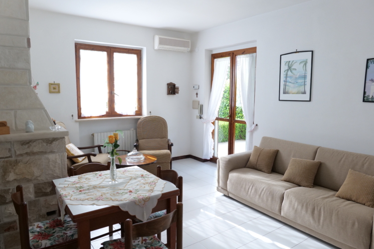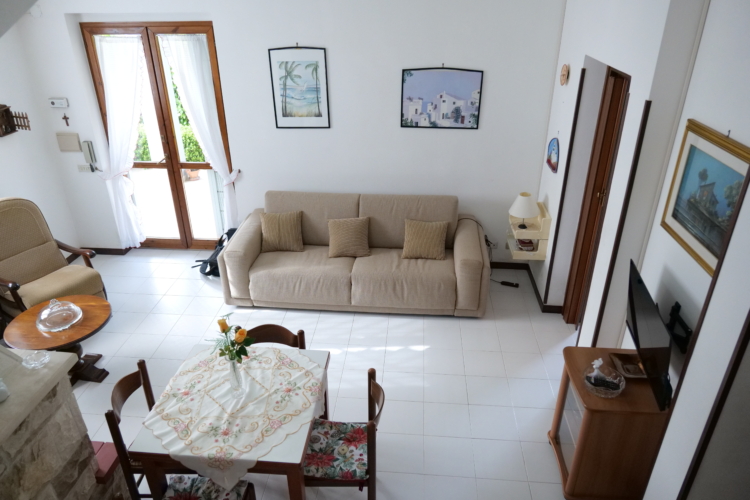 1. Zona giorno al piano terra: cucina abitabile e soggiorno con divano e TV.